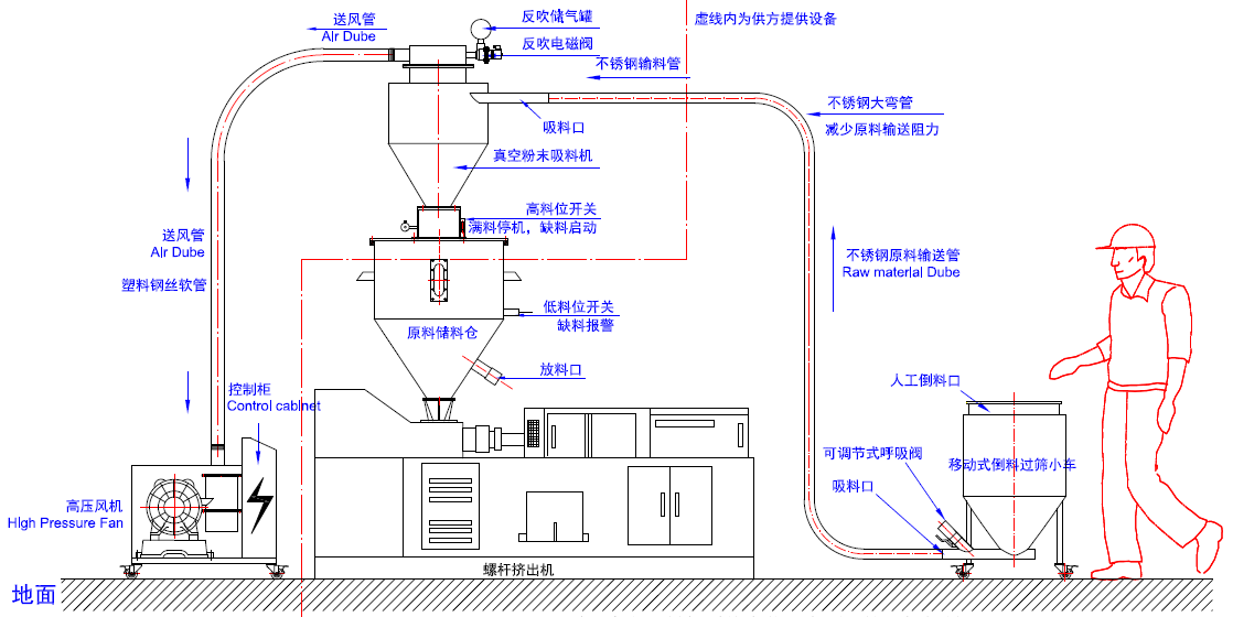 三:氣動(dòng)真空上料機(jī)與反應(yīng)釜、注塑機(jī)、擠出機(jī)、球磨機(jī)、包裝機(jī)、粉碎機(jī)、混合機(jī)、儲(chǔ)料倉(cāng)等設(shè)備配套。
