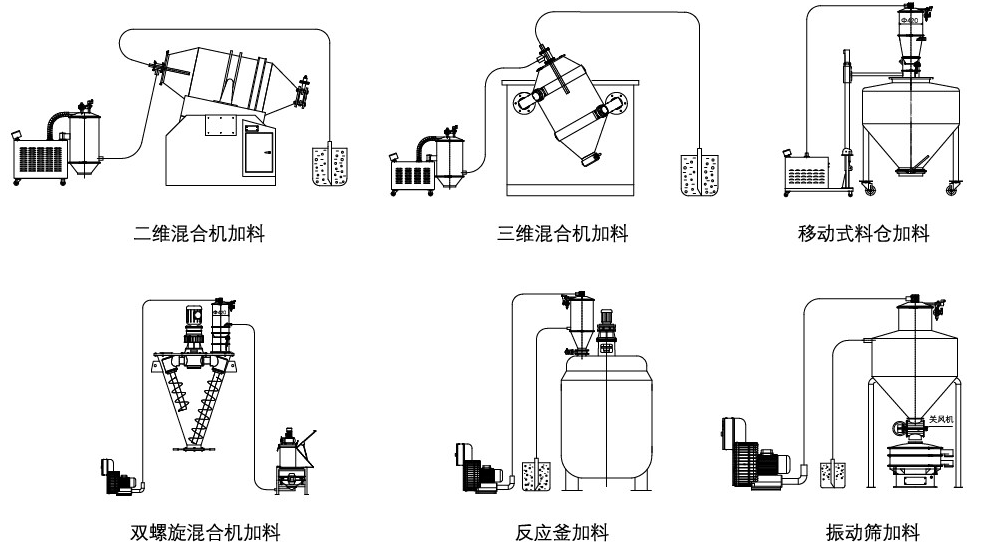 三:真空上料機與反應釜、注塑擠出機、球磨機、包裝機、粉碎機、混料機、各類料倉等一系列設備配套。